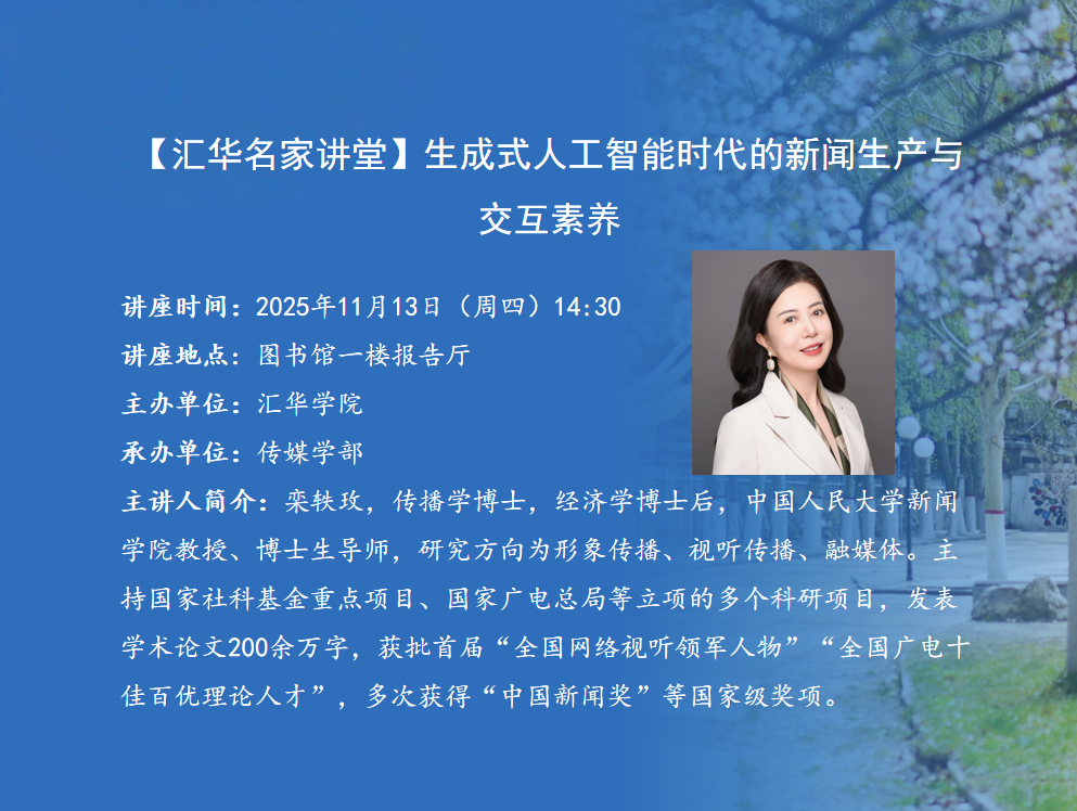 11月13日下午,中国人民大学新闻学院教授、博士生导师,新闻与社会发展研究中心研究员栾轶玫,做客“ac米兰官方网站名家讲堂”,为ac米兰师生作学术报告。栾轶玫教授在图书馆一楼报告厅作题为“生成式人工智能时代的新闻生产与交互素养”的学术报告。栾教授系统阐述了生成式人工智能对媒介生态、新闻生产及人机交互素养带来的深刻变革。结合丰富的视频案例,为在场师生生动解析了AIGC技术的应用现状与发展趋势。她指出,在人工智能时代,智能技术正带给媒介生态前所未有的变化,特别是AI合成技术导致海量网络信息真假难辨,真相探寻面临新挑战。在使用人工智能过程中,栾教授认为,一是要学会“judge”,不轻易做判断;二是与时俱进提升媒介素养;三是和任何人要进行有效沟通。在现场实践互动环节中,与会师生在栾教授的指导下,使用现有大模型平台,亲身体验人机协同完成内容创作的全过程,进一步加深了对人工智能工具使用的理解。讲座前,栾轶玫教授与副院长李振国、传媒学部教师代表和进行了座谈交流,就新闻学专业人才培养进行了探讨,对ac米兰新闻学专业人才培养给出了科学指导和合理建议。