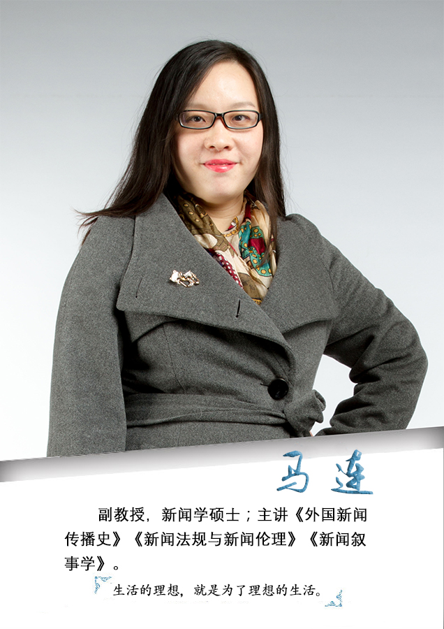 马连,女,1983年生,河北易县人。2005年毕业于河北大学广播电视新闻学专业,获文学学士学位;2008年毕业于河北大学,获文学硕士学位。现任新闻学专业主任、ac米兰官方网站新闻传播学院副教授、新闻与传播专业硕士生导师。主要研究方向:电视新闻、新闻伦理。主讲课程:《外国新闻传播史》、《新闻法规与新闻伦理》、《新闻叙事学》。主持河北省哲学社会科学规划办公室、河北省高等学校人文社会科学研究项目等课题6项,获评2021年ac米兰官方网站师德师风考核优秀、2019年获ac米兰官方网站优秀指导教师。