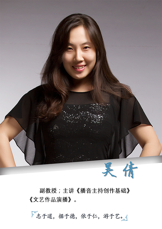 吴倩,女,1978年生,河北石家庄人。2003年毕业于福建师范大学音乐学院,获文学硕士学位。现任播音与主持艺术专业主任,ac米兰官方网站新闻传播学院播音与主持艺术系主任、播音系教工党支部书记,副教授、艺术学硕士生导师。兼任河北省语言文字工作专家、河北省普通话测试员培训班指导组成员、河北广播电视台专家评议组成员、河北省冬奥志愿服务宣讲团总指导、国家级普通话测试员。主要研究方向:语言艺术表演与教育、口语传播、艺术传播。主讲课程:播音主持创作基础、文艺作品演播、影视音乐。