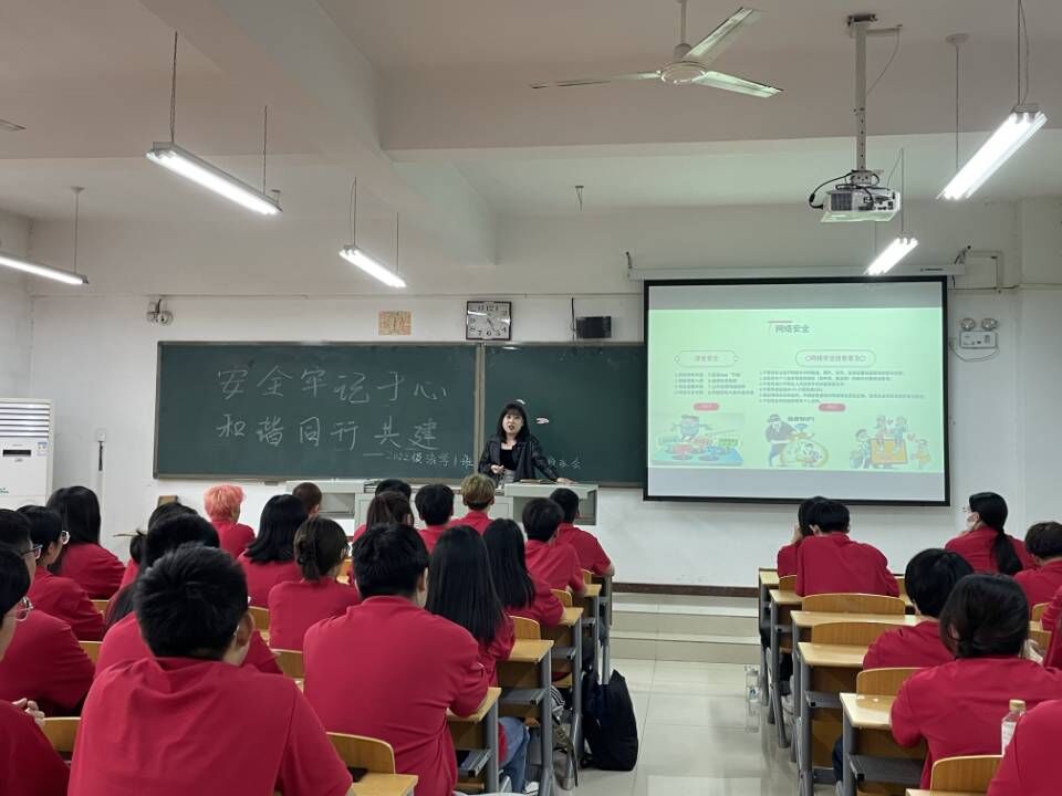 2022级法学专业召开安全教育主题班会-缩小 放大+ 2023-04-18为普及安全知识,营造关注安全、关爱生命的氛围,进一步增强学生的安全意识,提高防范各种安全事故的能力,2022级法学专业1班于4月13日下午在第六教学楼404教室开展安全教育主题班会,由贾枫老师组织,张晨曦主持,全班同学参与。 本次安全教育主题班会分为四部分。第一部分通过PPT课件形式分别对校园、交通、食品、消防、网络五个安全进行了阐述讲解,对存在的安全问题提出了解决方案还有防范措施,告诫同学们要提高自我保护能力,时刻敲响警钟;第二部分主要围绕网络安全,结合实际案例与同学展开交流互动,使同学们设身处地考虑自身处境安全,警醒同学们应提高安全意识,正确做好安全防范措施;第三部分围绕校园安全问题,从宿舍断电、保管好自身随身物品展开阐述。除此之外,向同学们发放“注意安全”表情包图片使大家更直观的感受到安全问题的重要性;最后,贾枫老师进行总结发言,着重强调了安全教育的重要意义,告诫同学们今后在各种场合都应提高警惕,不要有“贪婪之心”,克服“恐惧之心”,放弃“好奇之心”,警惕“麻痹之心”。