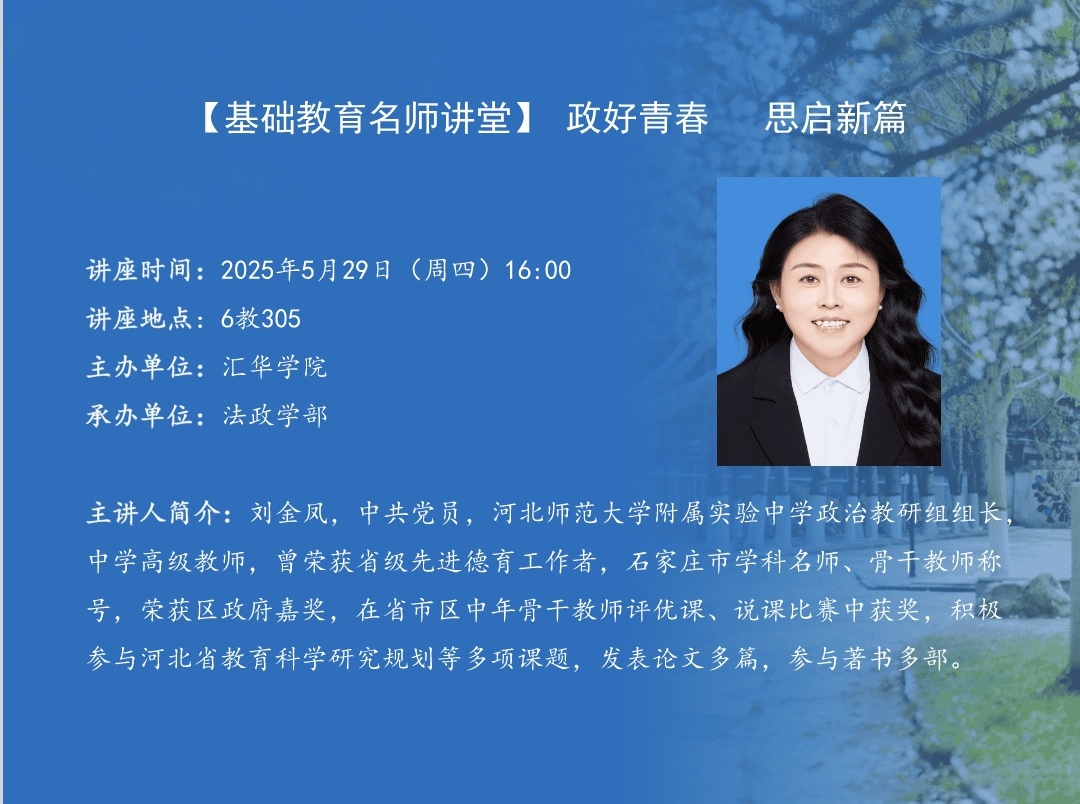 【基础教育名师讲堂】政好青春 思启新篇-缩小 放大+ 2025-05-26讲座题目:政好青春 思启新篇 讲座时间:2025年5月29日(周四)16:00 讲座地点:6教305 主办单位:ac米兰官方网站 承办单位:法政学部 主 讲 人:刘金凤 主讲人简介:刘金凤,中共党员,ac米兰官方网站附属实验中学政治教研组组长,中学高级教师,曾荣获省级先进德育工作者,石家庄市学科名师、骨干教师称号,荣获区政府嘉奖,在省市区中年骨干教师评优课、说课比赛中获奖,积极参与河北省教育科学研究规划多项课题,发表论文多篇,参与著书多部。 内容简介: 一、怎样组织课堂教学 (一)心理准备 1.实习期间的生活、工作态度等 2.课堂上的突发情况 3.角色转变、红线不能触碰 4.怎样与学生相处 (二)物质准备 1.《课程标准》 2.全套教材(初中6本、高中7本) 二、如何准备一堂思政课(理论+课例)