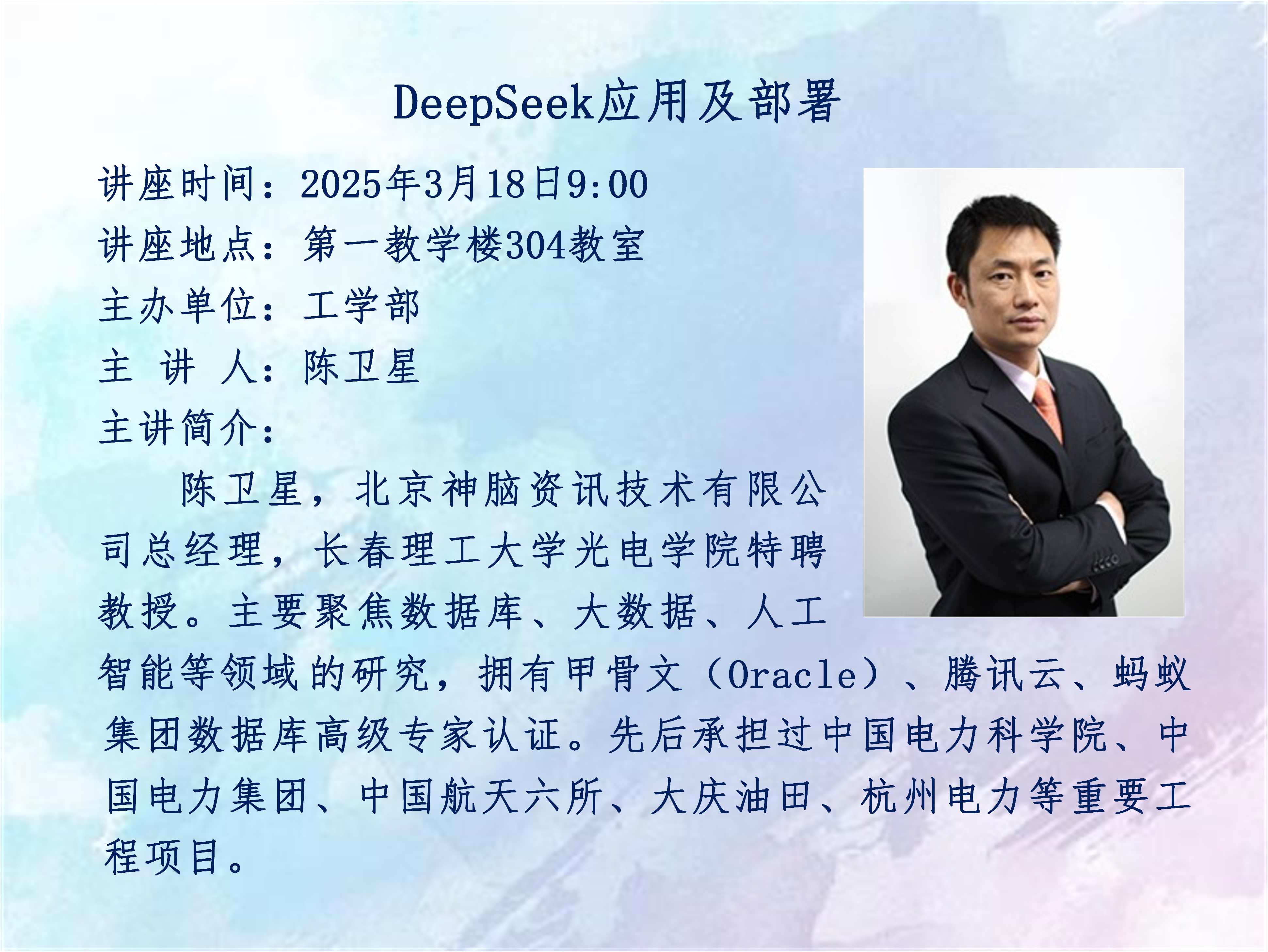 讲座题目:DeepSeek应用及部署讲座时间:2025年3月18日(周二)9:00                 2025年3月19日(周三)9:00讲座地点:第一教学楼304教室主办单位:ac米兰官方网站承办单位:  工学部主讲人:陈卫星主讲人简介:陈卫星,北京神脑资讯技术有限公司总经理,高级数据库专职讲师。同时,还是长春理工大学光电学院特聘教授、甘肃农业大学创业导师。主要聚焦数据库、大数据、人工智能等领域开展研究,拥有甲骨文(Oracle)、腾讯云、蚂蚁集团数据库高级专家认证。先后为中国电力科学院、中国航天六所、大庆油田、江苏电信、葛洲坝电厂、郑州 27 所提供数据库及操作系统培训。在项目方面,主持过信产部十省互联互通和重庆电信、江苏电信的备份恢复项目,负责过宁夏电信、新疆电信、杭州电力系统等的容灾项目,并承担过中国电力集团性能调优项目。内容简介:第一天1. 从DeepSeek 理性看待AI大模型发展趋势;2. 剖析 DeepSeek 技术原理与核心价值;3. DeepSeek 快速部署方案详解;4. 构建企业级私有知识库。第二天1. 分析AI岗位前景与必备技术;2. 大模型检索增强生成开发、微调与评估;3. 高质量数据集制作及多机多卡模型部署;4. 检索增强生成开发全流程、数据库选型与部署。