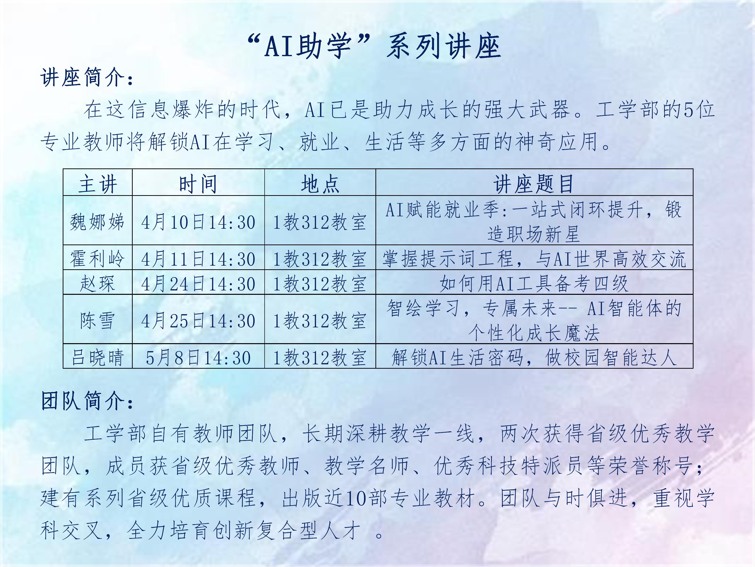 讲座题目:“AI助学”系列讲座讲座时间:2025年4月10日-5月8日讲座地点:第一教学楼312教室主办单位:ac米兰官方网站承办单位:  工学部主讲人:魏娜娣、霍利岭、赵琛、陈雪、吕晓晴主讲团队简介:ac米兰官方网站工学部自有教师团队,长期深耕教学一线,在计算机科学与技术专业课以及大学英语等课程的教学与实践指导领域已积累了多年丰富经验。团队两次荣获河北省优秀教学团队,成员获河北省优秀教师、河北省普通本科院校教学名师、河北省优秀科技特派员等荣誉称号,建设有河北省一流本科立项建设课程、河北省省级精品在线开放课程等优质课程,出版专业教材近10部。团队始终保持着与时俱进的学习态度,深刻认识到学科交叉融合对于创新人才培养的重要性。团队成员主动打破学科壁垒,积极探索计算机科学与技术与其他学科领域的交叉点,将不同学科的知识与理念有机融合到日常教学与实践指导中,致力于培养具有创新思维与综合素养的复合型人才。内容简介:魏娜娣:4月10日14:30,AI赋能就业季:一站式闭环提升,锻造职场新星霍利岭 :4月11日14:30,掌握提示词工程,与AI世界高效交流赵琛: 4月24日14:30,如何用AI工具备考四级陈雪:4月25日14:30,智绘学习,专属未来-- AI智能体的个性化成长魔法吕晓晴 :5月8日14:30,解锁AI生活密码,做校园智能达人