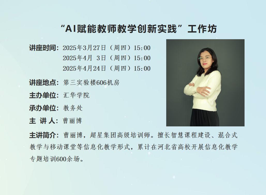 讲座题目:AI赋能教师教学创新实践讲座时间:2025年3月27日(周四)15:00(第一期)                 2025年4月3日(周四)15:00(第二期)                 2025年4月24日(周四)15:00(第三期)讲座地点:第三实验楼606机房主办单位:ac米兰官方网站承办单位:教务处主讲人简介:曹丽博,超星集团高级培训师。擅长智慧课程建设、混合式教学与移动课堂等信息化教学形式,累计在河北省高校开展信息化教学专题培训600余场。内容简介:第一期:智慧课程的组成要件;AI工作台助力老师减负增效; AI智能体助力学生个性化学习。第二期:任务引擎驱动高阶能力培养;知识图谱呈现教学模式创新。第三期:智慧课堂实战应用答疑;优秀智慧课程改革分享及点评。