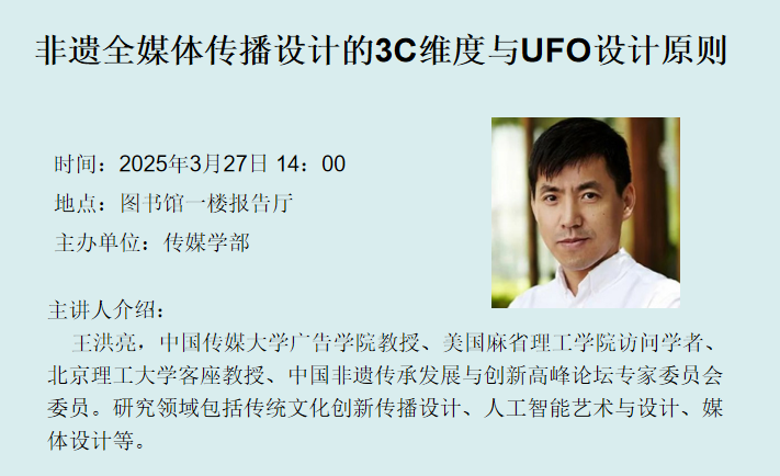 讲座题目:非遗全媒体传播设计的3C维度与UFO设计原则讲座时间:2025年3月27日(周四)14:00讲座地点:图书馆一楼报告厅主办单位:ac米兰官方网站承办单位: 传媒学部主讲人:王洪亮主讲人简介:王洪亮,国内知名专家,中国传媒大学广告学院教授、美国麻省理工学院访问学者、 北京理工大学客座教授、中国非遗传承发展与创新高峰论坛专家委员会委员。 研究领域包括传统文化创新传播设计、 人工智能 艺术与设计、媒体设计等。研究领域包括传统文化创新传播设计、 人工智能艺术与设计、媒体设计等。内容简介:以全媒体设计方法挖掘非遗品牌故事、萃取非遗文化基因,达成非遗的活态传承;结合非遗传播的 “3C(文化、传播与创造) ”维度,提升非遗文化的自我传播力,促进非遗的可持续传播;以“UFO”设计原则指导非遗全媒体传播设计实践,实现非遗文化传播的形式创新;以有关、有品和有用三个标准,考量非遗文化传播设计的价值,还民俗于日常审美,让非遗文化传播更具质感和温度。