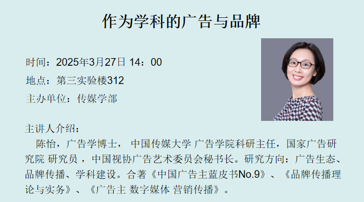 讲座题目:作为学科的广告与品牌讲座时间:2025年3月27日(周四)14:00讲座地点:第三实验楼312主办单位:ac米兰官方网站承办单位: 传媒学部主讲人:陈怡主讲人简介:陈怡,广告学博士, 中国传媒大学 广告学院科研主任,国家广告研究院 研究员 ,中国视协广告艺术委员会秘书长。研究方向:广告生态、品牌传播、学科建设。合著《中国广告主蓝皮书No.9》、《品牌传播理论与实务》、《广告主 数字媒体 营销传播》。内容简介:广告与品牌学融合心理学、社会学等多学科,历经百年发展,形成USP、品牌形象、定位等经典理论。研究涵盖消费者行为分析、数字广告效果追踪及跨文化营销策略。实践领域面临数字化转型挑战与机遇,如算法优化投放、元宇宙品牌体验。通过案例解析与行业趋势探讨,揭示广告从“说服术”到“价值共创”的演进,助力广告学专业把握创新方向。