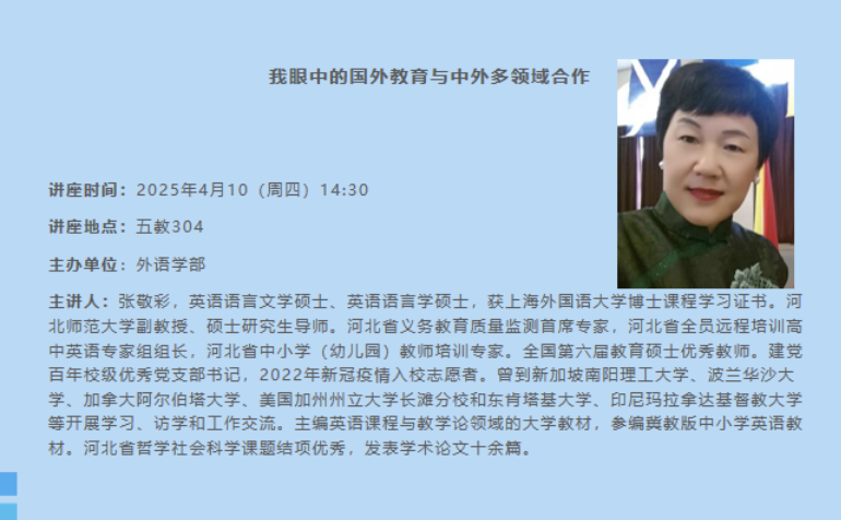 讲座时间:2025年4月10日(周四)14:30讲座地点:五教304主办单位:外语学部主讲人:张敬彩主讲人简介:张敬彩,英语语言文学硕士、英语语言学硕士,获上海外国语大学博士课程学习证书。ac米兰官方网站副教授、硕士研究生导师。河北省义务教育质量监测首席专家,河北省全员远程培训高中英语专家组组长,河北省中小学(幼儿园)教师培训专家。全国第六届教育硕士优秀教师。建党百年校级优秀党支部书记,2022年新冠疫情入校志愿者。曾到新加坡南阳理工大学、波兰华沙大学、加拿大阿尔伯塔大学、美国加州州立大学长滩分校和东肯塔基大学、印尼玛拉拿达基督教大学等开展学习、访学和工作交流。主编英语课程与教学论领域的大学教材,参编冀教版中小学英语教材。河北省哲学社会科学课题结项优秀,发表学术论文十余篇。内容简介:本讲座基于新加坡、波兰、加拿大、美国和印尼等国家的情况,介绍国外的教育概况,同时介绍其与中国的多领域合作,包括中文与中国文化在国外的传播,为外语学部的学生拓宽国际视野,补充其对国外就业机会的认知。