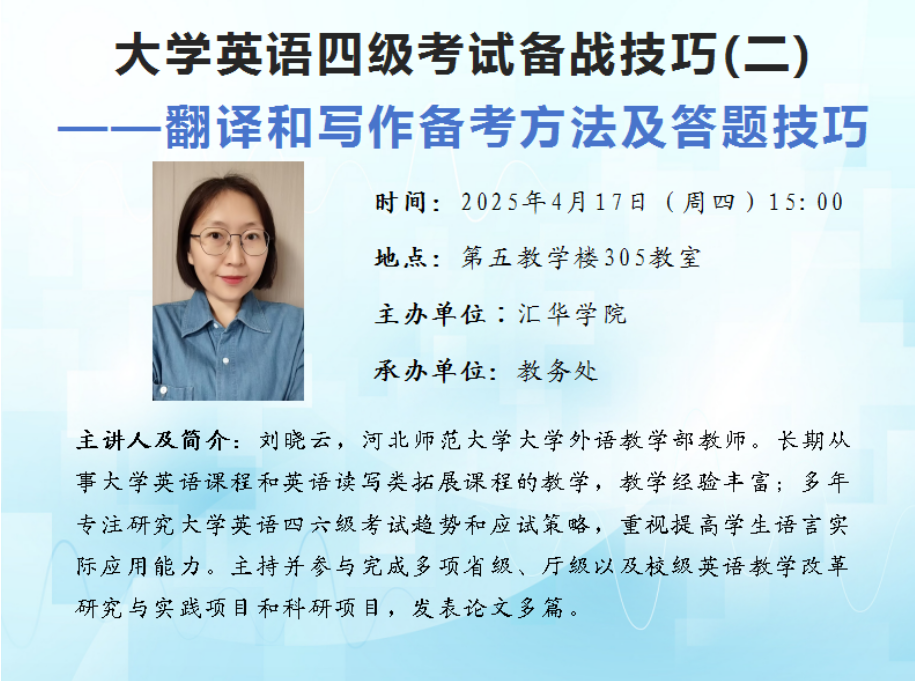 讲座题目: 大学英语四级考试备战技巧(二)——翻译和写作备考方法及答题技巧讲座时间: 2025年4月24日(周四)15:00讲座地点:第五教学楼305教室主办单位:ac米兰官方网站承办单位: 教务处主讲人: 刘晓云主讲人简介:刘晓云,ac米兰官方网站大学外语教学部教师。长期从事大学英语课程和英语读写类拓展课程的教学,教学经验丰富;多年专注研究大学英语四六级考试趋势和应试策略,重视提高学生语言实际应用能力。主持并参与完成多项省级、厅级以及校级英语教学改革研究与实践项目和科研项目,发表论文多篇。