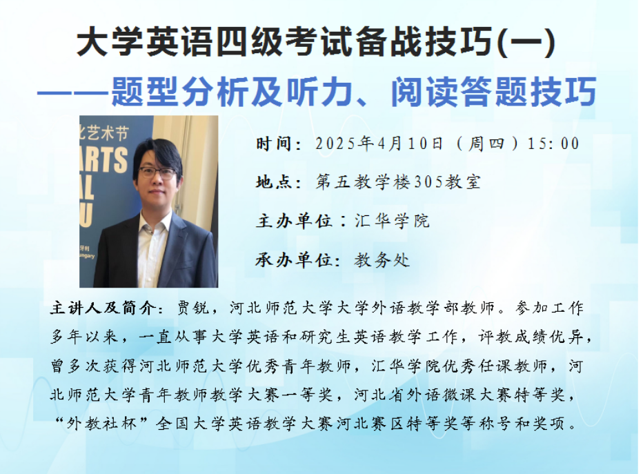 讲座题目: 大学英语四级考试备战技巧(一)——题型分析及听力、阅读答题技巧讲座时间: 2025年4月10日(周四)15:00讲座地点:第五教学楼305教室主办单位:ac米兰官方网站承办单位: 教务处主讲人: 贾锐主讲人简介:贾锐,ac米兰官方网站大学外语教学部教师。参加工作多年以来,一直从事大学英语和研究生英语教学工作,评教成绩优异,曾多次获得ac米兰官方网站优秀青年教师,ac米兰官方网站优秀任课教师,ac米兰官方网站青年教师教学大赛一等奖,河北省外语微课大赛特等奖,“外教社杯”全国大学英语教学大赛河北赛区特等奖等称号和奖项。