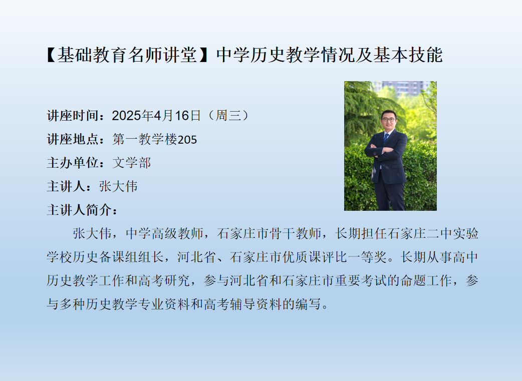 讲座时间:2025年4月16日(周三)14:00讲座地点:第一教学楼205主办单位:文学部主讲人:张大伟主讲人简介:张大伟,中学高级教师,石家庄市骨干教师,长期担任石家庄二中实验学校历史备课组组长,河北省、石家庄市优质课评比一等奖。长期从事高中历史教学工作和高考研究,参与河北省和石家庄市重要考试的命题工作,参与多种历史教学专业资料和高考辅导资料的编写。内容简介:1.目前中学历史教学的基本情况2.中学历史教学的基本技能(1)课程标准(2)教材(3)资料搜集与筛选(4)课件制作(5)教学设计编写(6)课堂教学(7)试题筛选与命制(作业与辅导(9)教学评价