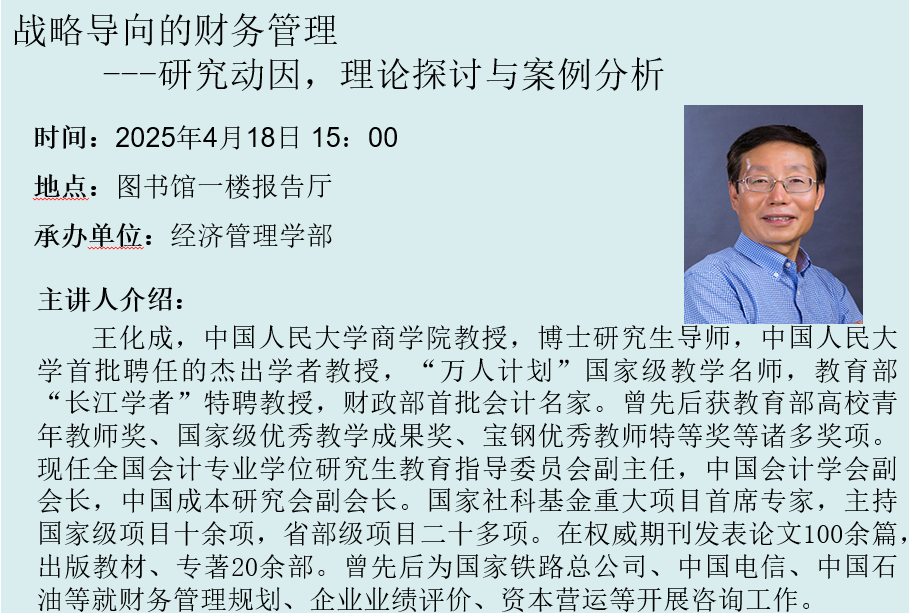 讲座题目:战略导向的财务管理---研究动因,理论探讨与案例分析讲座时间:2025年4月18日 15:00讲座地点:图书馆一楼报告厅主办单位:ac米兰官方网站承办单位:经济管理学部主讲人:王化成主讲人简介:王化成,中国人民大学商学院教授,博士研究生导师,中国人民大学首批聘任的杰出学者教授,“万人计划”国家级教学名师,教育部“长江学者”特聘教授,财政部首批会计名家。曾先后获教育部高校青年教师奖、国家级优秀教学成果奖、宝钢优秀教师特等奖等诸多奖项。现任全国会计专业学位研究生教育指导委员会副主任,中国会计学会副会长,中国成本研究会副会长。国家社科基金重大项目首席专家,主持国家级项目十余项,省部级项目二十多项。在权威期刊发表论文100余篇,出版教材、专著20余部。曾先后为国家铁路总公司、中国电信、中国石油等就财务管理规划、企业业绩评价、资本营运等开展咨询工作。内容简介:全球化背景下,战略导向的财务管理是企业应对内外部环境变革、实现可持续发展的理论创新与实践探索。本讲座将结合企业真实案例深刻剖析解读如何以企业战略目标为核心,实现战略决策与财务活动的动态协同管理。