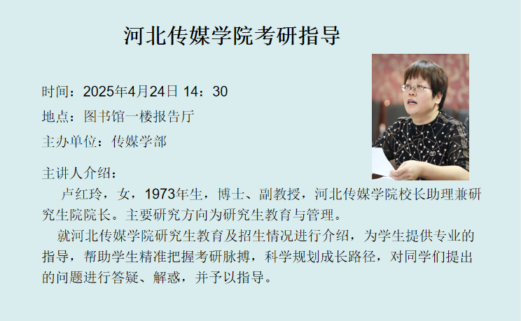 讲座题目:河北传媒学院考研指导讲座时间:2025年4月24日(周四)14:30讲座地点:图书馆一楼报告厅主办单位: 传媒学部主讲人:卢红玲主讲人简介:卢红玲,女,1973年生,博士、副教授,河北传媒学院校长助理兼研究生院院长。主要研究方向为研究生教育与管理。内容简介:就河北传媒学院研究生教育及招生情况进行介绍,为学生提供专业的指导,帮助学生精准把握考研脉搏,科学规划成长路径,对同学们提出的问题进行答疑、解惑,并予以指导。