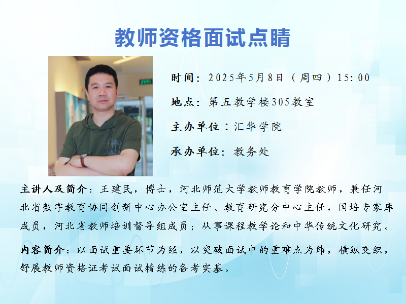 讲座题目:教师资格面试点睛讲座时间:2025年5月8日(周四)15:00讲座地点:第五教学楼305教室主办单位:ac米兰官方网站承办单位:教务处主讲人:王建民主讲人简介:王建民,博士,ac米兰官方网站教师教育学院教师,兼任河北省数字教育协同创新中心办公室主任、教育研究分中心主任,国培专家库成员,河北省教师培训督导组成员;从事课程教学论和中华传统文化研究。内容简介:以面试重要环节为经,以突破面试中的重难点为纬,横纵交织,舒展教师资格证考试面试精练的备考实基。