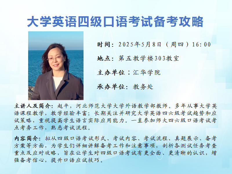 讲座题目:大学英语四级口语考试备考攻略讲座时间:2025年5月8日(周四)16:00讲座地点:第五教学楼303教室主办单位:ac米兰官方网站承办单位:教务处主讲人:赵平主讲人简介:赵平,ac米兰官方网站大学外语教学部教师。多年从事大学英语课程教学,教学经验丰富;长期关注并研究大学英语四六级考试趋势和应试策略,重视提高学生语言实际应用能力。一直参加师大四六级口语考试考点考务工作,熟悉考试流程。内容简介:拟从四级口语考试形式、考试内容、考试流程、真题展示、备考方案等方面,为学生们详细讲解备考工作和注意事项,剖析各测试任务考查重点及应对攻略,旨在让学生对四级口语考试有更全面、更清晰的认识,增强备考信心,提升口语应试技巧。