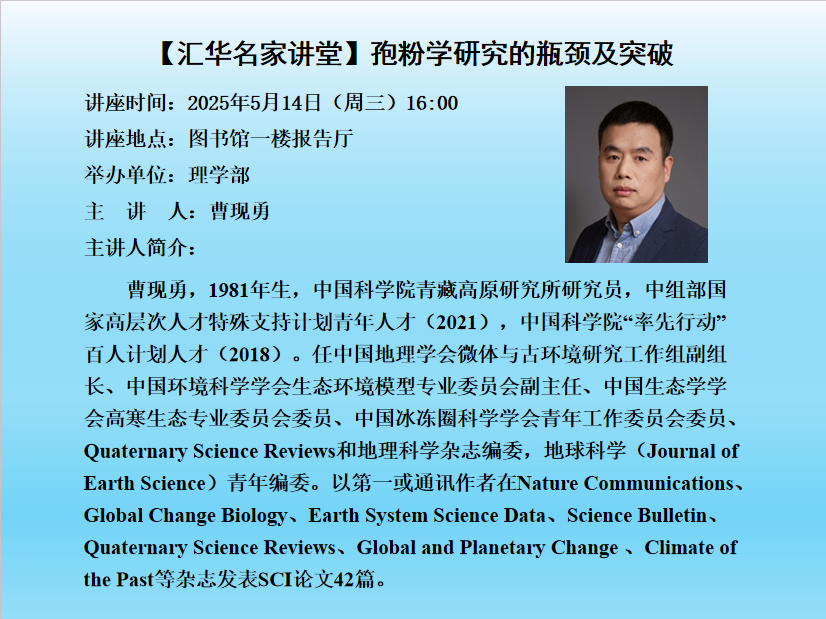 题目:孢粉学研究的瓶颈及突破时间:2025年5月14日 16:00地点:图书馆一楼报告厅主办单位:ac米兰官方网站承办单位:理学部主讲人及简介:曹现勇,1981年生,中国科学院青藏高原研究所研究员,中组部国家高层次人才特殊支持计划青年人才(2021),中国科学院“率先行动”百人计划人才(2018)。任中国地理学会微体与古环境研究工作组副组长、中国环境科学学会生态环境模型专业委员会副主任、中国生态学学会高寒生态专业委员会委员、中国冰冻圈科学学会青年工作委员会委员、Quaternary Science Reviews和地理科学杂志编委,地球科学(Journal of Earth Science)青年编委。以第一或通讯作者在Nature Communications、Global Change Biology、Earth System Science Data、Science Bulletin、Quaternary Science Reviews、Global and Planetary Change 、Climate of the Past等杂志发表SCI论文42篇。