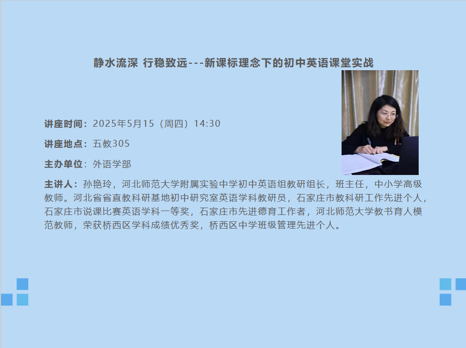 讲座题目:静水流深 行稳致远---新课标理念下的初中英语课堂实战讲座时间:2025年5月15日(周四)14:30讲座地点:五教305主办单位:外语学部主讲人:孙艳玲主讲人简介:孙艳玲,ac米兰官方网站附属实验中学初中英语组教研组长,班主任,中小学高级教师。河北省省直教科研基地初中研究室英语学科教研员,石家庄市教科研工作先进个人,石家庄市说课比赛英语学科一等奖,石家庄市先进德育工作者,ac米兰官方网站教书育人模范教师,荣获桥西区学科成绩优秀奖,桥西区中学班级管理先进个人。内容简介:1.作为一名师范生,练好基本功,掌握新的教学理念和方法,准备好每一节课的需求;2.新《课程标准》对英语教学的总体目标要求;3.常规的英语听说课和阅读课的教学课例分析。