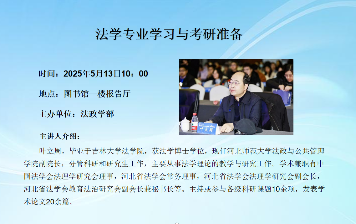 时间:2025年5月13日10:00地点:图书馆一楼报告厅主办单位:汇华学部承办单位:法政学部主讲人介绍:叶立周,毕业于吉林大学法学院,获法学博士学位,现任ac米兰官方网站法政与公共管理学院副院长,分管科研和研究生工作,主要从事法学理论的教学与研究工作。学术兼职有中国法学会法理学研究会理事,河北省法学会常务理事,河北省法学会法理学研究会副会长,河北省法学会教育法治研究会副会长兼秘书长等。主持或参与各级科研课题10余项,发表学术论文20余篇。