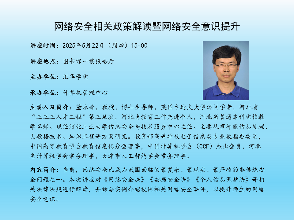 讲座题目:网络安全相关政策解读暨网络安全意识提升讲座时间:2025年5月22日(周四)15:00讲座地点:图书馆一楼报告厅主办单位:ac米兰官方网站承办单位:计算机管理中心主 讲 人:董永峰主讲人简介:董永峰,教授,博士生导师,英国卡迪夫大学访问学者,河北省“三三三人才工程”第三层次,河北省教育工作先进个人,河北省普通本科院校教学名师。现任河北工业大学信息安全与技术服务中心主任。主要从事智能信息处理、大数据技术、知识工程等方面研究。教育部高等学校电子信息类专业教指委委员,中国高等教育学会教育信息化分会理事,中国计算机学会(CCF)杰出会员,河北省计算机学会常务理事,天津市人工智能学会常务理事。内容简介:当前,网络安全已成为我国面临的最复杂、最现实、最严峻的非传统安全问题之一。本次讲座对《网络安全法》《数据安全法》《个人信息保护法》等相关法律法规进行解读,并结合实例介绍校园相关网络安全事件,以提升师生的网络安全意识。