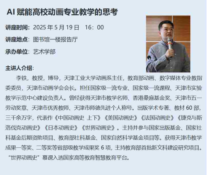 讲座时间:2025年5月19日 16:00讲座地点:图书馆一楼报告厅主办单位:ac米兰官方网站承办单位:艺术学部主讲人:李铁主讲人简介:李铁,教授,博导,天津工业大学动画系主任,教育部动画、数字媒体专业教指委委员,天津市动画学会会长。担任国家级一流专业、国家级一流课程、天津市实验教学示范中心建设负责人。曾经获得天津市教学名师、香港桑麻基金奖、天津市五一劳动奖章、天津市优秀教师、天津市师德先进个人称号。出版学术专著、教材60部,三千余万字,代表作《中国动画史 上下》《美国动画史》《法国动画史》《捷克与斯洛伐克动画史》《日本动画史》《世界动画史》。主持并参与国家出版基金、国家社科基金后期资助项目、教育部社科基金、国家自然科学基金项目等。获得天津市教学成果一等奖、二等奖等省部级教学成果奖6项,主持教育部首批新文科建设研究项目。“世界动画史”慕课入选国家高等教育智慧教育平台。内容简介:一、AIGC发展:动画创作的“智变”与高校教学的应对二、AI教学生态:高校动画专业教学的重构与融合三、课程建设:AI赋能下的高校动画课程创新路径四、产业流程:AI驱动的动画产业变革与高校教学的衔接