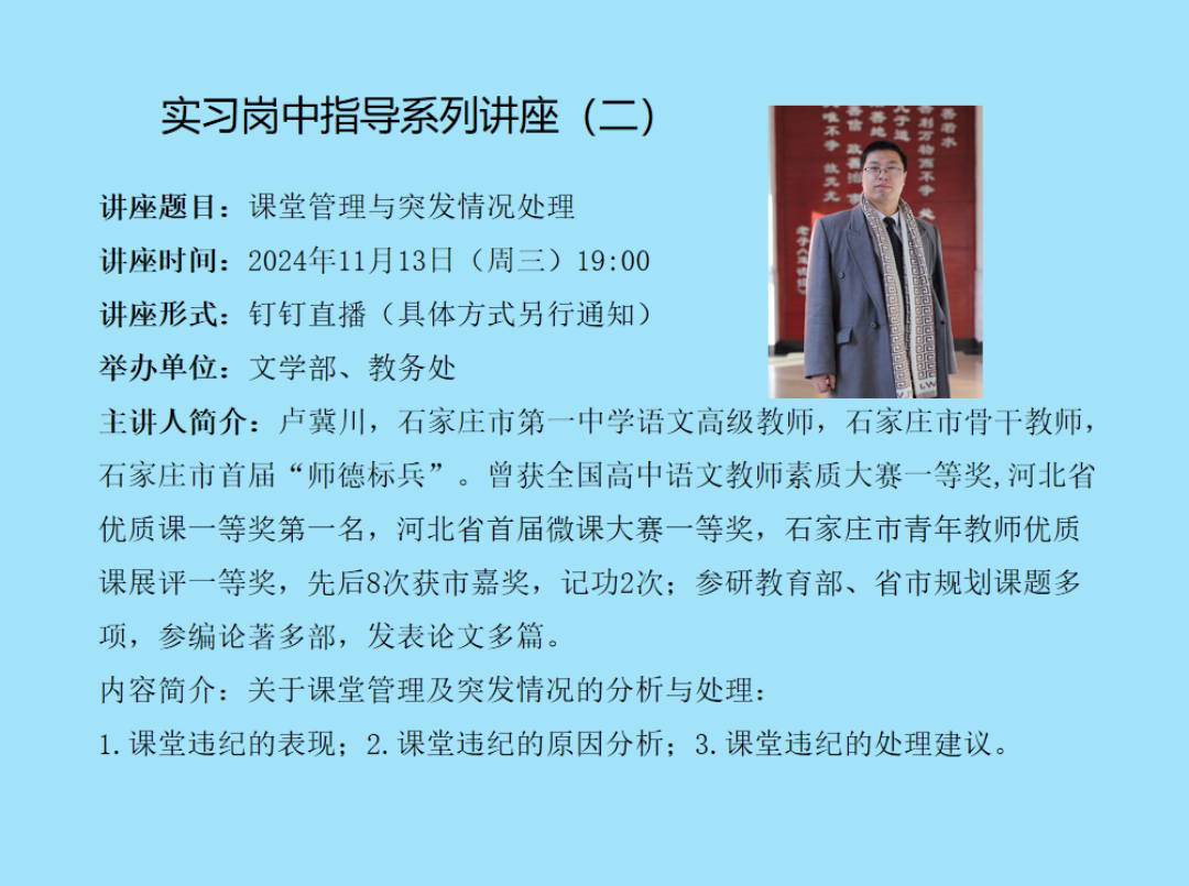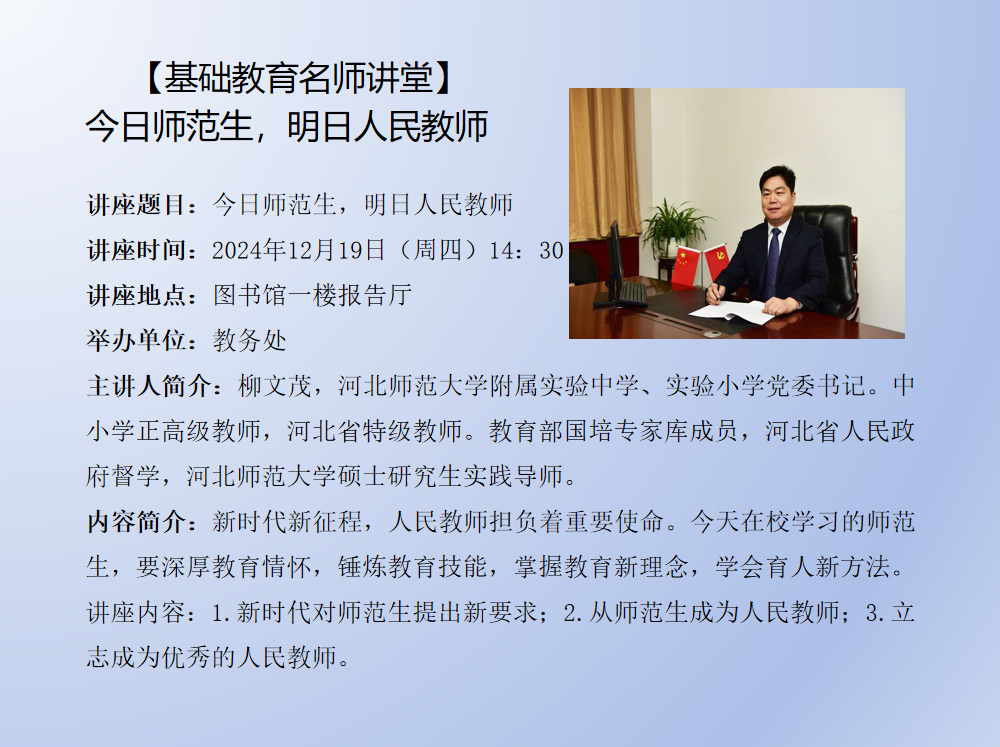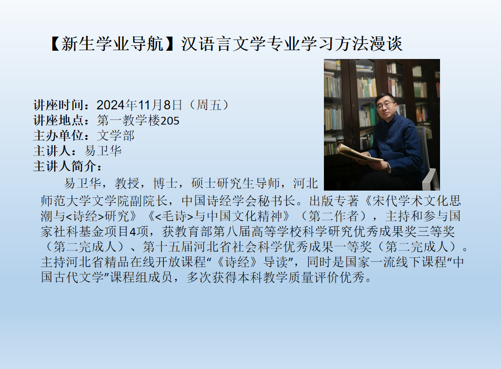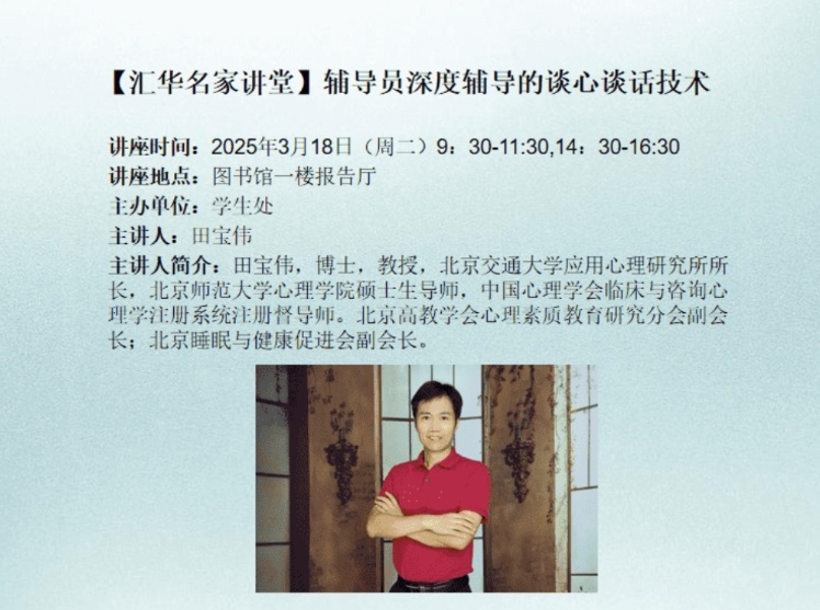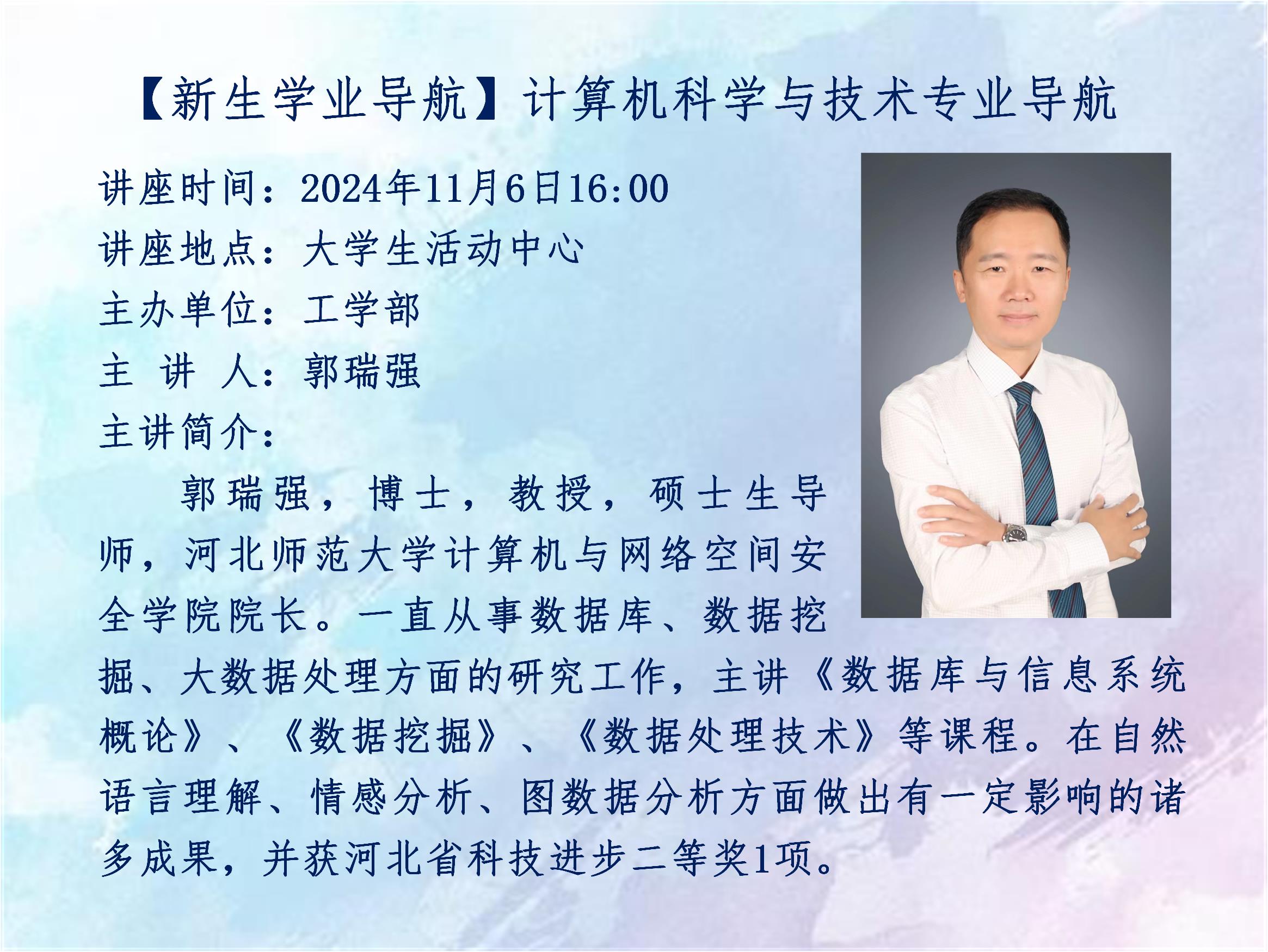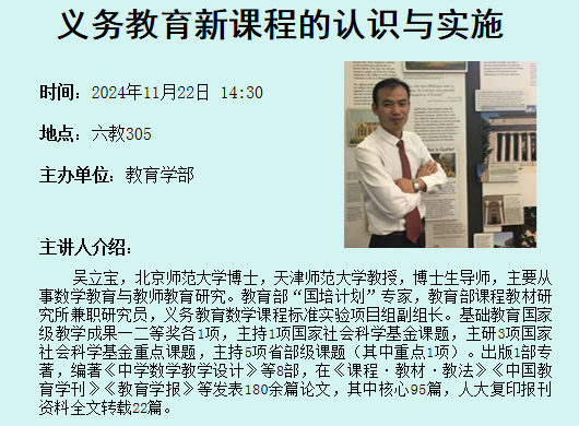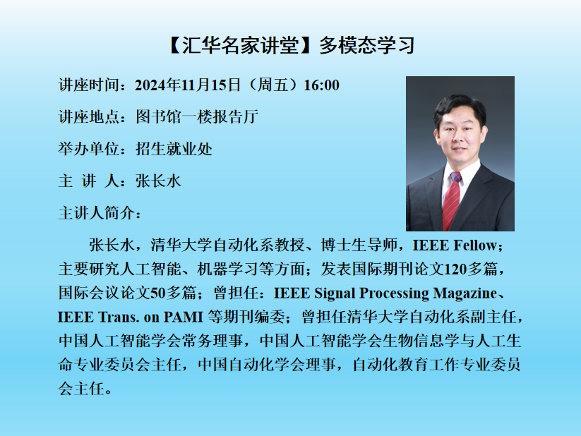 题目:多模态学习时间:2024年11月15日 16:00地点:图书馆一楼报告厅主办单位:招生就业处主讲人及简介:张长水,清华大学自动化系教授、博士生导师,IEEE Fellow;主要研究人工智能、机器学习等方面;发表国际期刊论文120多篇,国际会议论文50多篇;曾担任:IEEE Signal Processing Magazine、IEEE Trans. on PAMI 等期刊编委;曾担任清华大学自动化系副主任,中国人工智能学会常务理事,中国人工智能学会生物信息学与人工生命专业委员会主任,中国自动化学会理事,自动化教育工作专业委员会主任。