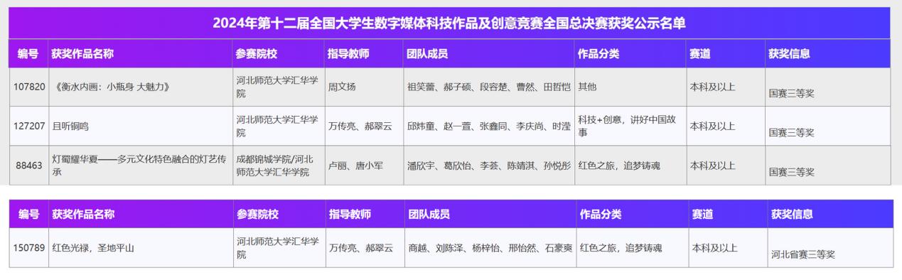 全国大学生数字媒体科技作品及创意竞赛由中国人工智能学会和全国大学生数字媒体科技作品及创意竞赛组织委员会共同主办,入选2024年教育部中国高等教育学会大学生学科竞赛排行榜单。在此次竞赛中,传媒学部2022新闻学专业祖笑蕾团队作品《衡水内画:小瓶身 大魅力》、2023级广告学专业邱炜童团队作品《且听铜鸣》、2023级广告学专业孙悦彤团队作品《灯蜀耀华夏——多元文化特色融合的灯艺传承》获国赛三等奖、河北省省赛二等奖。2022级新闻学专业商越团队作品《红色光禄,圣地平山》获得河北省省赛三等奖。