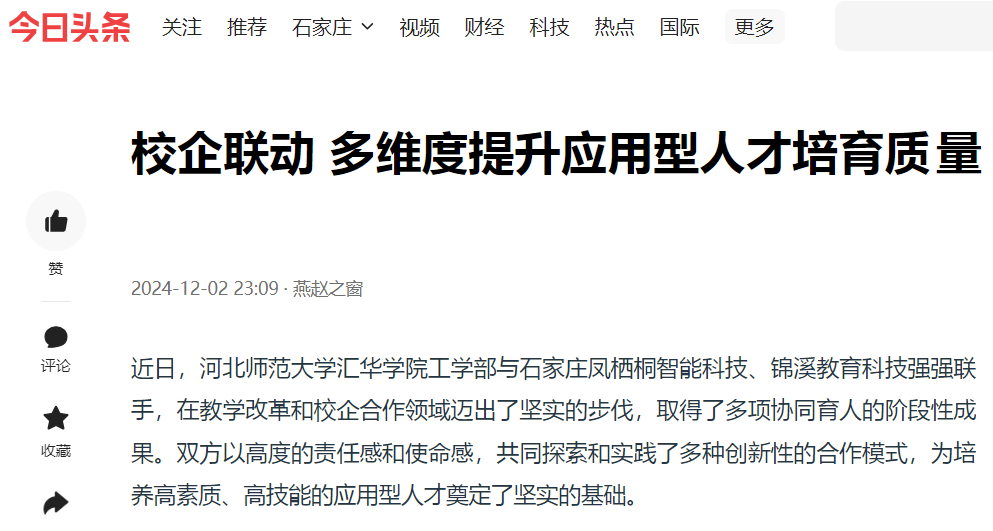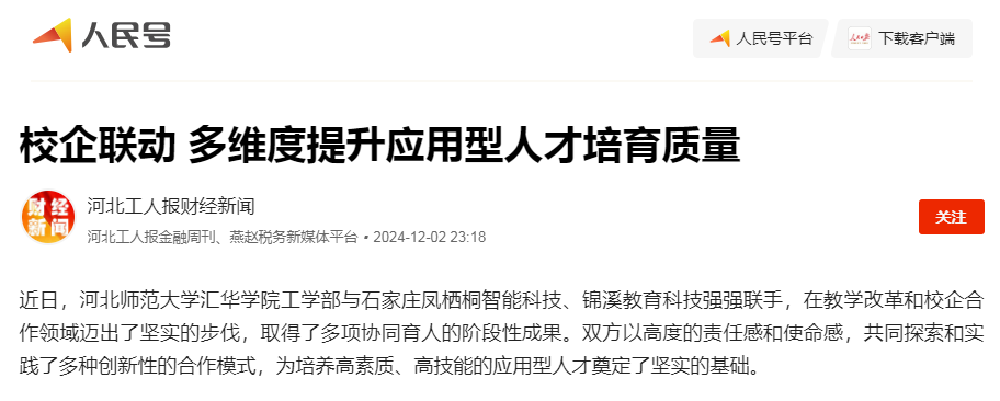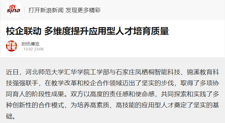 12月2日,今日头条、网易新闻、搜狐新闻、新浪新闻、燕赵时讯、燕赵财经、财经时讯、时代之窗、河北工人报财经新闻等多家媒体对ac米兰“校企联动 多维度提升应用型人才培育质量”的举措进行了报道。