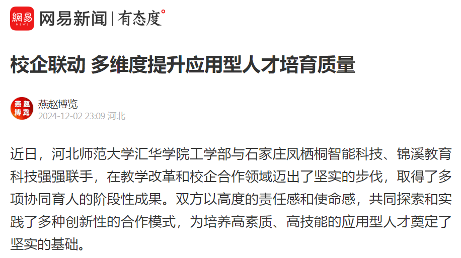 近日,ac米兰官方网站工学部与石家庄凤栖桐智能科技、锦溪教育科技强强联手,在教学改革和校企合作领域迈出了坚实的步伐,取得了多项协同育人的阶段性成果。双方以高度的责任感和使命感,共同探索和实践了多种创新性的合作模式,为培养高素质、高技能的应用型人才奠定了坚实的基础。