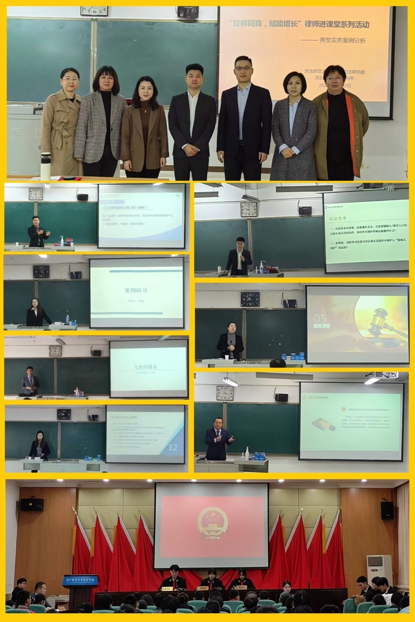 为全面落实中共中央办公厅、国务院办公厅发布的《关于加强新时代法学教育和法学理论研究的意见》,法政学部积极推动产教融合,拓展校外资源,深化法学专业的实践教学。本学期,学部加强与河北冀华律师事务所的合作,邀请该所实务经验丰富且具有较高理论素养的资深律师走进课堂,双师同育,赋能增长,在法学专业人才培养方案中,积极探索构建《典型实务案例分析》特色课程,聘任8位律师为实务导师,为2022级法学专业学生授课。通过课程构建的有益尝试和创新探索,让学生近距离接触行业律师,思考分析真实的法律案例,进一步提升了学生的法律思维和实务操作技能,为未来的职业生涯奠定了坚实基础。