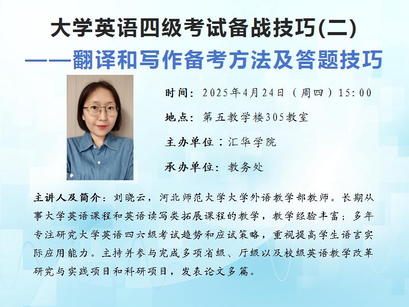 讲座题目: 大学英语四级考试备战技巧(二)——翻译和写作备考方法及答题技巧
