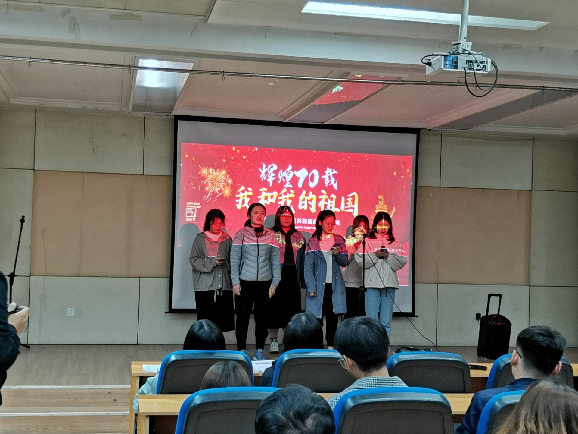 活动由王程欣、李婷主持,在说明团日活动的表现形式及举办活动的目的后,表演正式开始。304宿舍表演的诗歌朗诵《红旗飘飘》,向同学们展示了红色的旗帜象征着中华人民共和国的红色革命,旗上的五颗五角星及其相互关系象征共产党领导下的革命人民大团结。307宿舍展示的手语节目《我和我的祖国》,表演形式新颖,营造了良好的活动氛围,使祖国之爱融于每个中国人的心中。302宿舍表演的诗歌朗诵《我深深爱恋的祖国》,赞颂了祖国如昂首高吭的雄鸡,唤醒拂晓的沉默;如冲天腾飞的巨龙,叱咤时代的风云;如威风凛凛的雄狮,舞动神州的雄风,激发了全体学生的爱国情怀。孙浩方同学独唱的歌曲《我是中华好儿孙》,诠释了中华儿孙的傲骨与正气,将活动氛围带向高潮。301宿舍准备的英汉朗诵《I love my motherland》,鼓励全体学生爱祖国就像爱自己的家,对祖国充满希望,为祖国贡献自己的一份微薄之力,让人民因为生为中国人而感到骄傲。305宿舍带来的歌曲《国家》,揭示了国和家之间相依相伴、相辅相成、密不可分的关系,爱国爱家,国才会强大。602宿舍带来的小品《紧急后送》,向同学们讲述了中国军人这一称谓总是和牺牲与奉献联系在一起的,没有军人,就不会有和平;没有军人,就不会有现在的新中国。坚守,是军人对祖国最长情的告白。由303和306宿舍共同准备的歌曲大合唱《我们都是追梦人》,同时也作为压轴出场节目,激励同学们勇担重任、矢志报国,要打牢知识基础、不懈攀登。新时代的号角呼唤着有担当、有梦想的青年加入到实现中国梦的洪流之中,争做最美奋斗者、最强筑梦人!