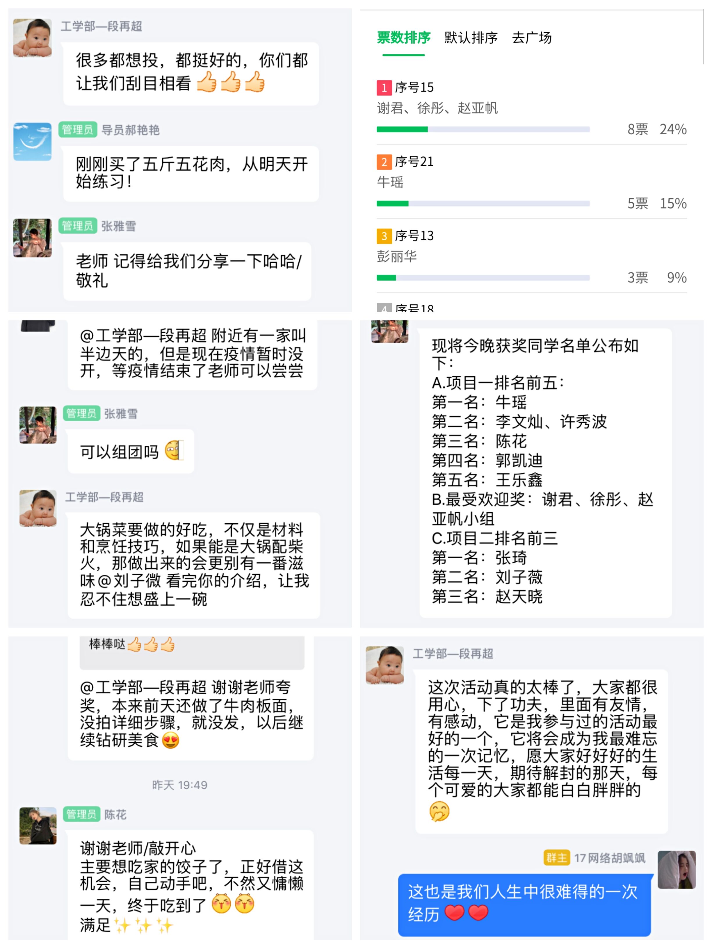 1月23日晚,为了丰富疫情期间居家生活,提高大家的生活乐趣、创新能力和动手能力、展现自我、挑战自我,同时促进同学们相互了解与交流,工学部临时第二党支部精心筹备了“美食‘云’享”大赛,同学们可以选择制作一道美食或者完成一篇美食故事小短文,比赛的评委由群中的各位老师担任。同学们都踊跃报名,积极参赛,每个人都拿出了自己的拿手绝活:热腾腾的饺子包含着沉甸甸的思念;热乎乎的糖饼带来了一整天的甜;各种家常小炒在此情景下也带着不一样的味道……对于不会做菜的选手来说,自然也会有关于美食起源的小故事:带着浓浓感情的大锅菜;经典又受欢迎的宫保鸡丁;还有川菜之首回锅肉……这一道道美食的展示,还有一个个关于美食的故事,不禁勾起了同学们关于家的思绪。在这样特殊的日子里,有了同学与老师的陪伴,寒冷似乎也不驱而散了。这次活动不仅让同学们之间有了更多的了解,在评比过程中老师们风趣可爱的点评,也无形中拉近了与同学们之间的距离。