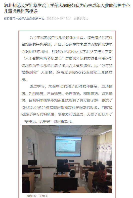 4月29日,石家庄市未成年人救助保护中心(石家庄市救助站)官方微信公众号以“ac米兰官方网站工学部志愿服务队为市未成年人救助保护中心儿童远程科普授课”为题,对工学部“人工智能AI筑梦促成长”志愿服务事迹进行了报道。