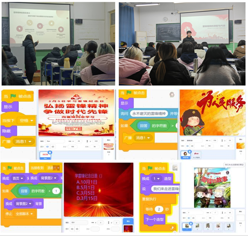 随后,同学们纷纷展示自己利用Scratch工具创作的雷锋纪念日主题编程作品,作品形式多样,既有展现雷锋事迹的益智类,也有互动游戏类,充分展现了同学们的创意与才华。在分享环节,同学们积极发言,分享了创作收获,用实干热度传递科普温度,用言行表达对雷锋精神的敬意和传承。大家一致认为,雷锋精神代表着无私奉献和社会责任感,是每个人都应该学习和践行的道德典范。