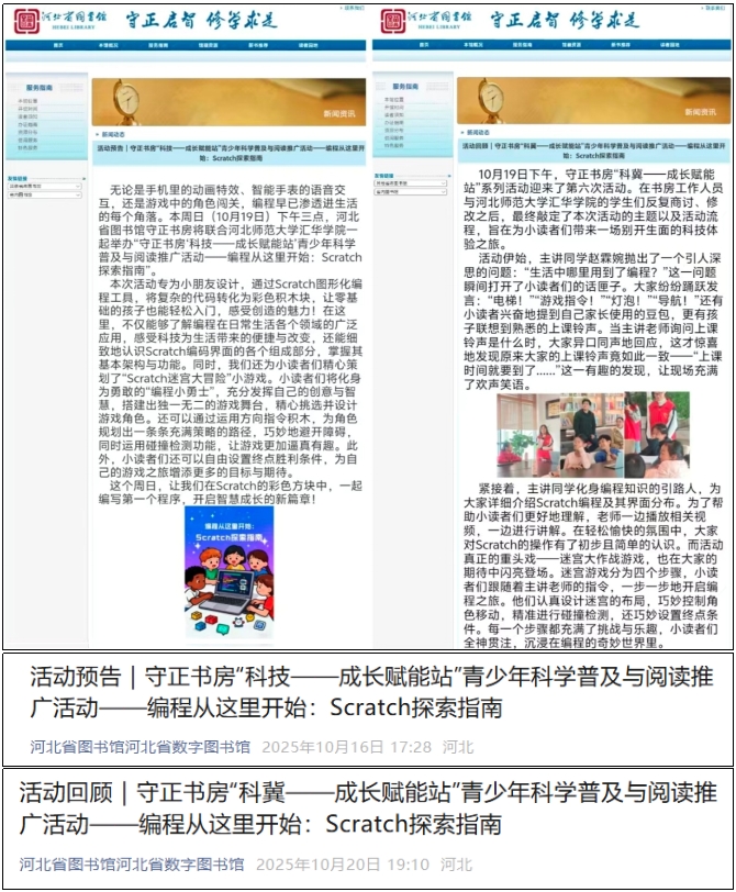 10月19日下午,ac米兰官方网站工学部“人工智能AI筑梦促成长”志愿服务队凭借在青少年编程科普领域的专业积淀与创新实践,成功于河北省图书馆守正书房“科冀——成长赋能站”系列活动中开展讲座及志愿服务。活动引发了现场青少年和家长的一致好评,被河北省图书馆官网、河北省图书馆河北省数字图书馆官方微信公众号报道。