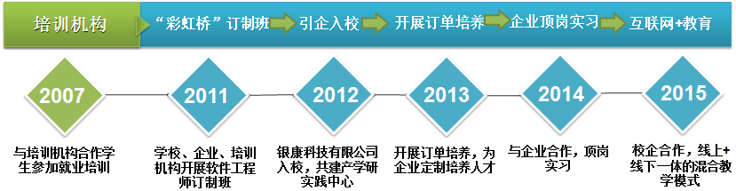 同时工学部不断探索“订单式”人才培养模式,该模式将学校教学与区域经济发展实际同就业一线岗位需求有机结合,也使得工学部各专业的学生在行业内成为了高精尖的人才。现已开展了“银康订单班”、“文思海辉订单班”、“博彦科技订单班”、“神州数码订单班”等,以提高学生的就业质量与水平,学部连续4年被学院评为“就业先进集体”。此外,基于“互联网+教育”时代背景,信息工程学部不断深化教育改革,2015年学部与极客学院、海同科技等优秀企业正式达成校企合作意向,依托“互联网+教育”学习实践平台,将互联网思维运用到传统教学中,共同探索并实践新一代信息技术背景下基于线上、线下一体的混合式教学模式,实现“线上线下双轨教学”。