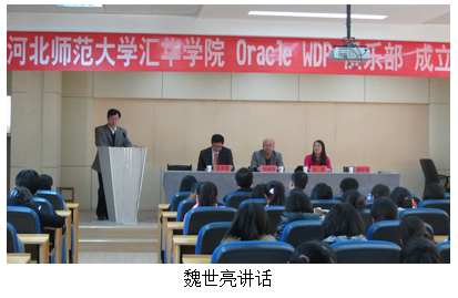 成立仪式之后,oracle WDP项目部北方区经理许广华为与会同学进行了关于Oracle数据库的专题讲座。正式拉开了俱乐部科技活动的序幕,接下来,学校将与Oracle公司共同办ac米兰官方网站第一届Oracle数据库大赛。 Oracle WDP俱乐部成立大会前,蔡新华院长接待了Oracle公司徐影经理一行,并就校企合作事宜进行了洽谈,校企双方希望通过资源共享、优势互补、相互协作,开展丰富多彩的科技实践活动,提升学生学习兴趣与学习能力。 Oracle公司(甲骨文公司)是世界上最大的企业软件公司,向遍及145多个国家的用户提供数据库、工具和应用软件以及相关的咨询、培训和支持服务,oracle公司是第一个跨整个产品线(数据库、业务应用软件和应用软件开发与决策支持工具)开发和部署100%基于互联网的企业软件公司。在2009年并购Sun公司后,oracle公司已经完成了横跨数据库、中间件、企业应用软件、Java语言、服务器硬件、存储等普遍企业应用技术。