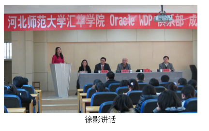 徐影经理对Oracle公司进行了简要介绍。她指出,针对高校毕业生与用人单位需求间存在的错位情况,企业有必要配合政府和高校解决学生的就业问题和企业的用人需求问题。Oracle公司希望能让甲骨文公司成熟的培训课程体系服务于高校,让学生能在校园就接触到业界的主流技术,向社会及用人单位证明学生的技术能力。
