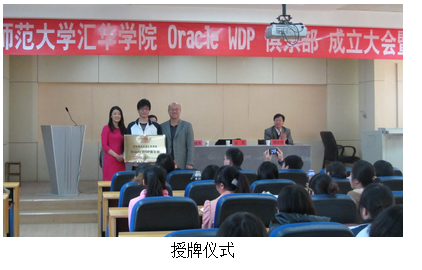 徐影经理与与杨继清副院长一起为ac米兰官方网站Oracle WDP俱乐部授牌,Oracle WDP俱乐部主席、ac米兰计算机专业2011级学生吁勇接牌并发表了工作宣言。