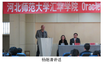 最后,杨继清副院长代表校方对Oracle WDP俱乐部的成立表示祝贺,杨院长在讲话中强调,WDP俱乐部的成立,是校企双方真诚合作,共谋发展的成果,学院非常重视,大力支持。学院会与企业积极配合,为WDP俱乐部各项科技活动的开展提供良好环境与条件,希望企业能够在技术培训、项目实践、师资培训以及数据库大赛等方面给予大力支持。同时希望参加这一项目的同学们能够遵守纪律、抓住机遇、勤学苦练、勇于探索,借助校企合作的平台,提高自身专业技能与科技创新能力。